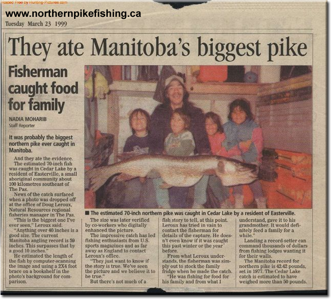 The fish would have been a Manitoba Record Northern Pike but does not qualify as it ended up as dinner. The present Manitoba record Pike is 59 inches.