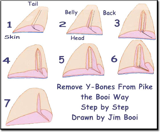 Your knife should not be razor sharp. Start with a fillet, skin on and ribs out. It's important to note that pike bones angle upwards to the back of the fish. Ribs out and skin on you take your knife held vertically starting at the tail, press lightly and swipe the fillet to expose the bones left in the meat.