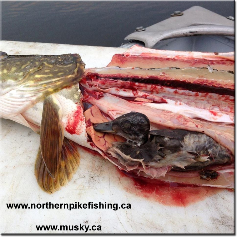 My friend Mike caught this Northern Pike and when he cleaned it he found this baby duck in its stomach. A duckling is nothing. We have caught Northern Pike with Muskrat tails hanging out their mouths.